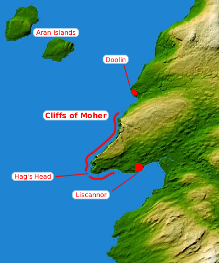 Максимальная высота скал Мохер достигает 214 метров — там, где стоит Башня О’Брайена, — над уровнем мор. И в ясный день с береговых утёсов открывается великолепный вид на Атлантический океан, далекий залив Гэлоуэй (Galway bay), Аранские острова.